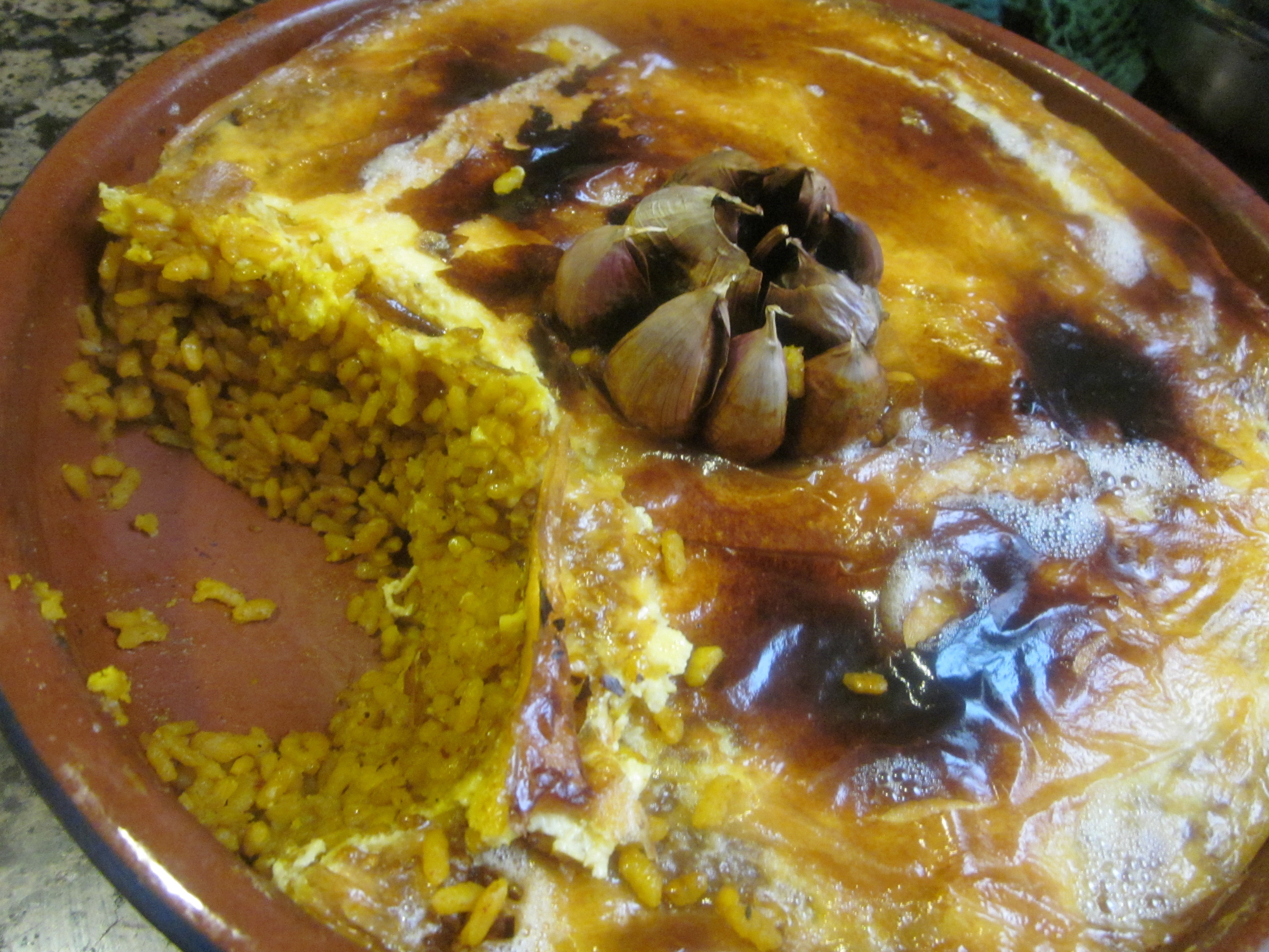 Agafa 500 grs. d’arròs i neteja’l bé en aigua freda i una última vegada en aigua calenta. Després deixa’l secar bé. Pren una cassola de fang i posa-hi els 500 grs. d’arròs, 1 litre de brou de carn ben concentrat i que estigui calent, safrà i, al centre, una cabeça d’alls sencera. Seguidament posa-ho al forn durant 15 minuts a 180ºC. 5 minuts abans que acabi la cocció, posa-hi allioli fet amb 2 rovells d’ou, 2 grans d’all i 15 cl. d’oli; es tirarà per sobre l’arròs. Posa-ho al forn per a acabar la cocció. L’allioli formarà una crosta molt gustosa. Es serveix ben calent.